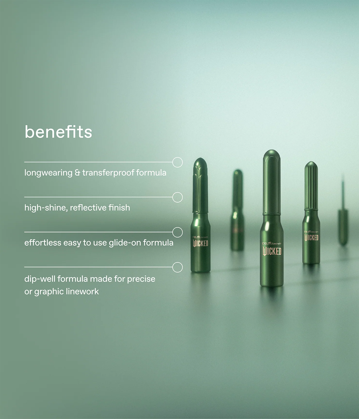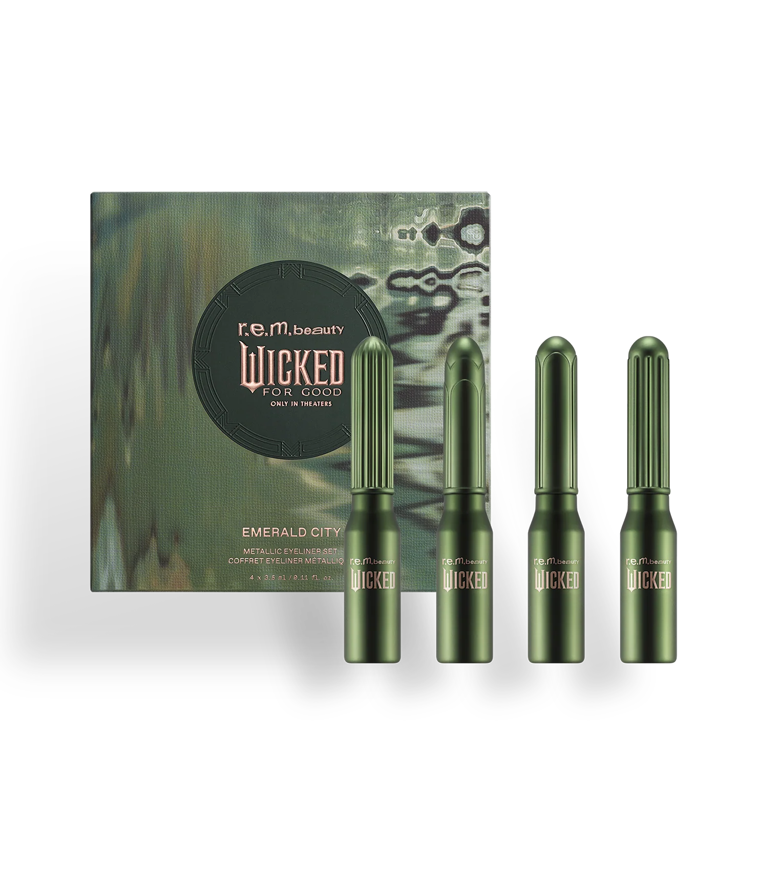 a limited edition r.e.m. beauty x Wicked: For Good set of dip-well liners that feature metallic tones in oz’s most beloved shades from cool toned silver to warm bronze with a reimagined gold and a metallic forest green. designed for precision and creativity, these eyeliners let you craft everything from bold graphic looks to fine, delicate linework.