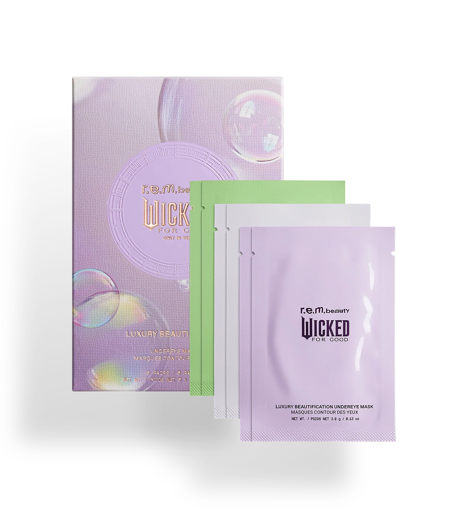our limited edition r.e.m. beauty x Wicked: For Good undereye gel masks, are supercharged with hyaluronic acid & caffeine leaving skin feeling soothed and hydrated. these shimmering gel masks go to work while you relax or prep for makeup in holographic tones inspired by glinda’s bubble, emerald city’s green, and the tin man’s silver.